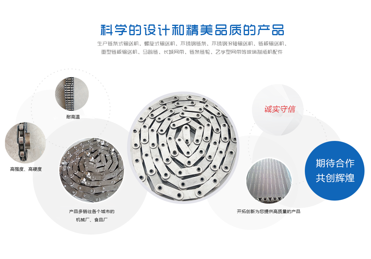 生產(chǎn)鏈條式輸送機(jī)、螺旋式輸送機(jī)、不銹鋼鏈條、不銹鋼滾軸輸送機(jī)、鏈板輸送機(jī)、重型鏈板輸送機(jī)、馬蹄鏈、長城網(wǎng)帶、鏈條鏈輪、乙字型網(wǎng)帶等玻璃制瓶機(jī)配件,食品機(jī)械配件及各種網(wǎng)帶的專業(yè)廠家 ,多年來產(chǎn)品暢銷各地玻璃廠和食品廠,在玻璃制品等行業(yè)中享有較高的聲譽(yù)。公司集摸具開發(fā)、機(jī)械設(shè)計生產(chǎn),銷售于一體的生產(chǎn)型企業(yè)。生產(chǎn)的自動化流水線金屬傳動網(wǎng)帶、鏈條等產(chǎn)品廣泛用于玻璃機(jī)械、食品機(jī)械、化纖機(jī)械、醫(yī)藥、電子、烘干機(jī)械、輪胎機(jī)械等行業(yè)。產(chǎn)品多銷往各個城市的機(jī)械廠、食品廠和一些涉及流水線或自動化設(shè)備的公司。